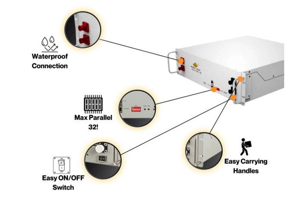 - Expandable Modular Design: Unleash flexibility with the modular and expandable design, supporting the connection of up to 32 batteries. Seamlessly expand your energy system to meet evolving demands, maximizing efficiency and adaptability for your unique power requirements.